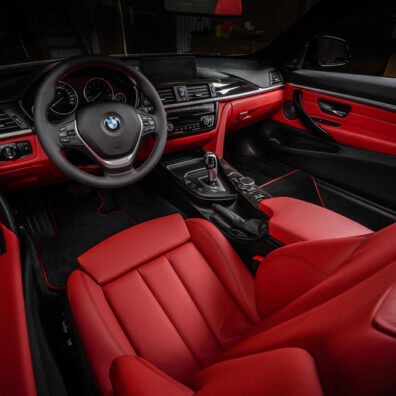 І фінальний етап – повна перетяжка всього салону, підлокітників, низу торпедо та центральні частини дверей – червоною високоякісною шкірою!