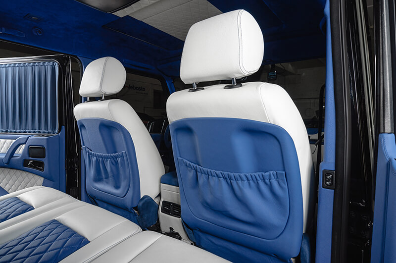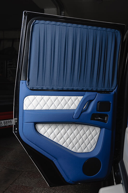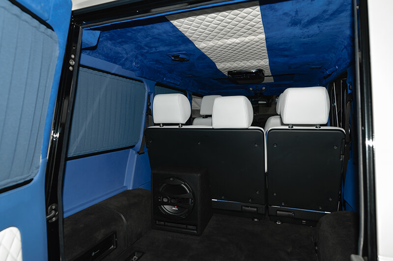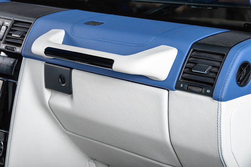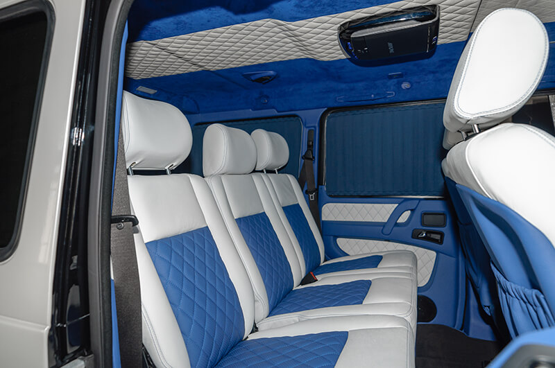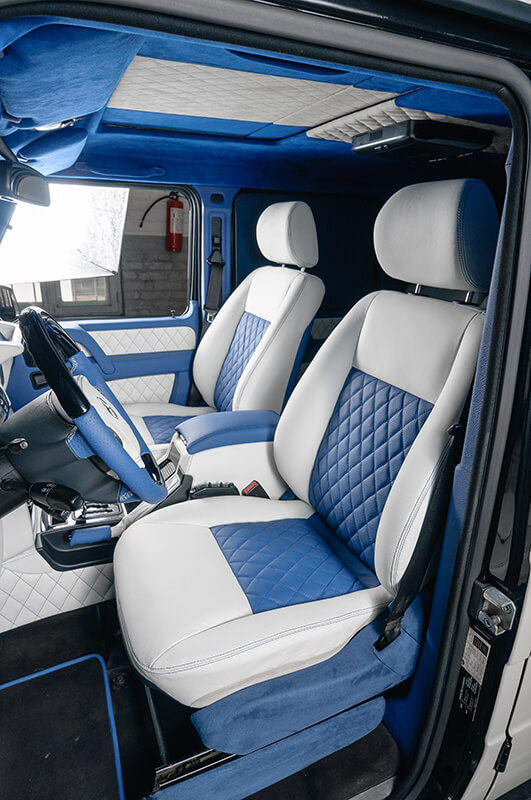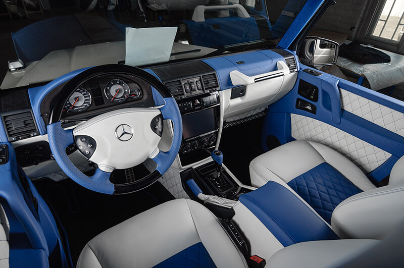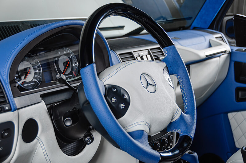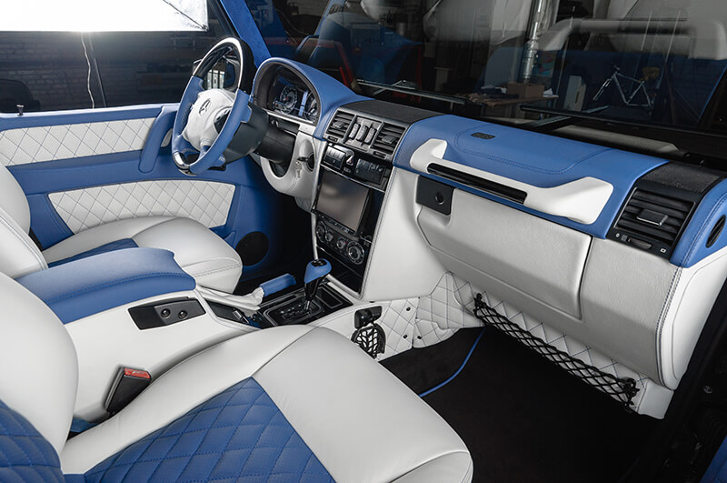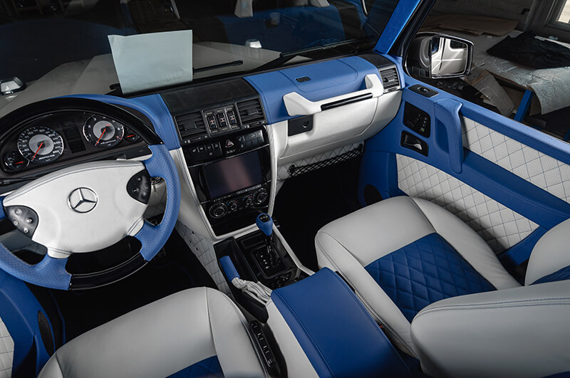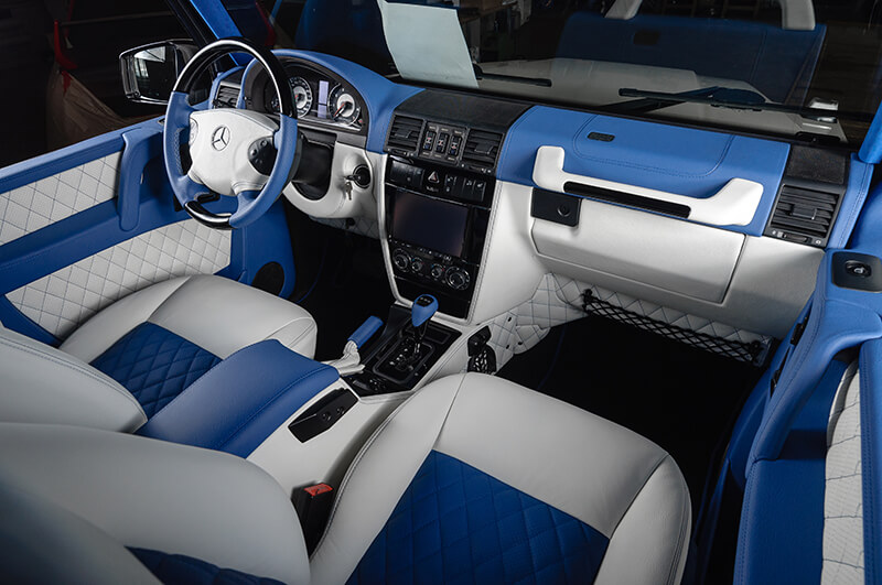 Кожей синего цвета были перетянуты верх торпедо, основная часть карт дверей, центральные вставки сидений и карманы для дополнительной поклажи позади них, подлокотник, а также обод рулевого колеса и рукоятки КПП и ручного тормоза. Белую кожу использовали при оформлении центральной части руля, нижней части торпедо, стойки органов управления, вставок в карты дверей, сидений, а также при изготовлении чехла для ручника. Не обошлось в этом проекте на тюнинг Mercedes G55 без перфорации, которая присутствует на коже руля, центральных вставках сидений и дверных карт.