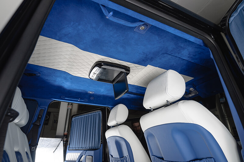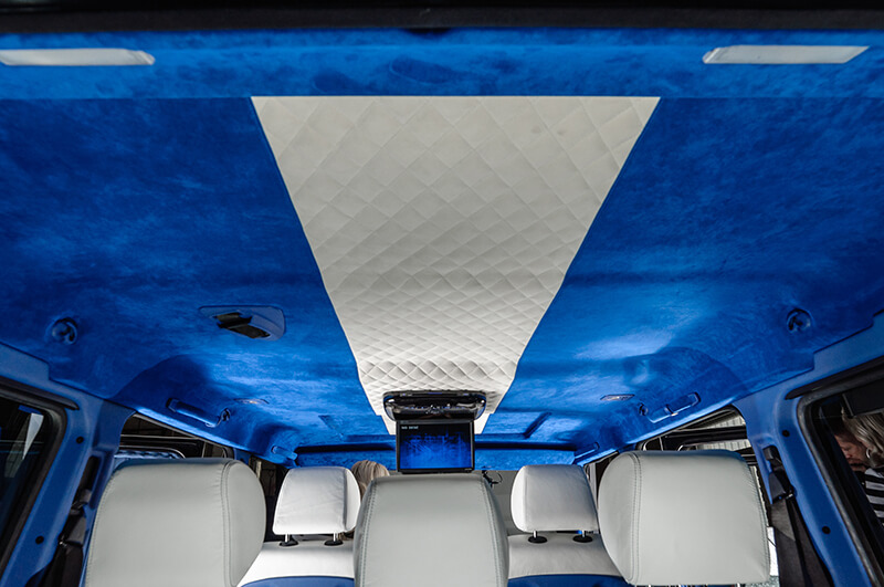 Потолок оформили под общий стиль всего салона – синяя алькантара, как основа и центральная часть из алькантары белого цвета, где уютно расположился потолочный монитор. Весь потолочный пластик покрашен в тон.