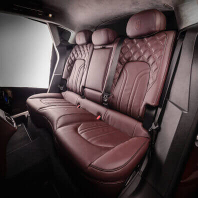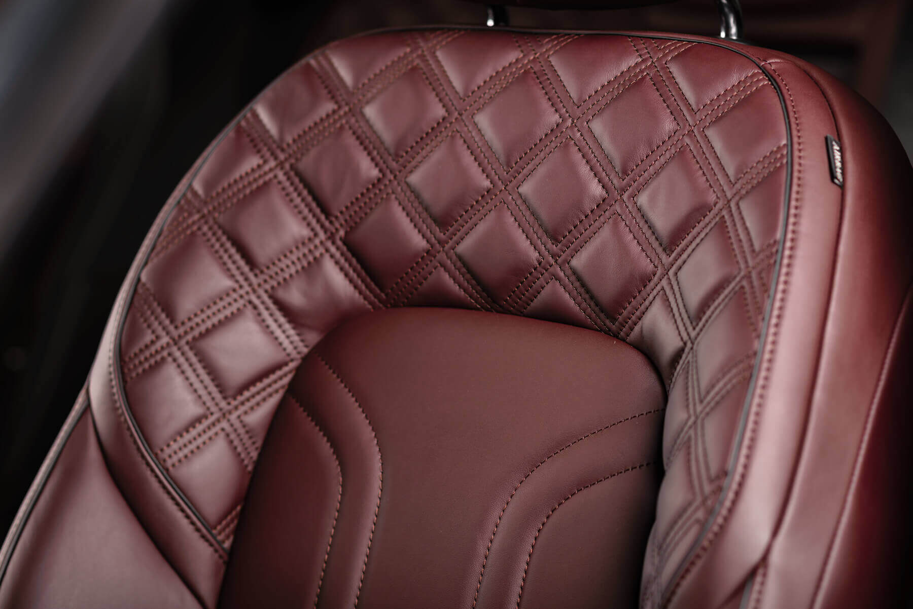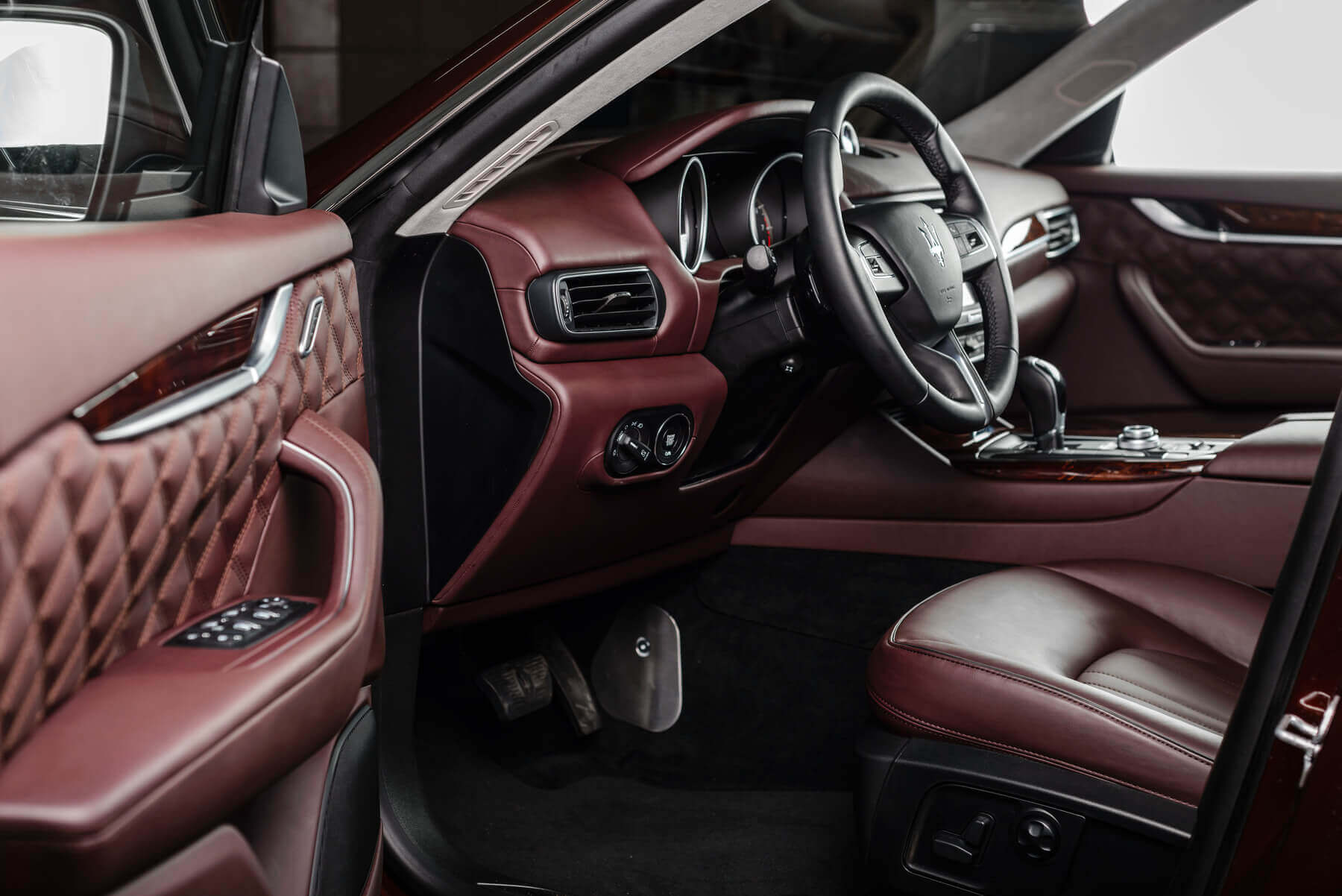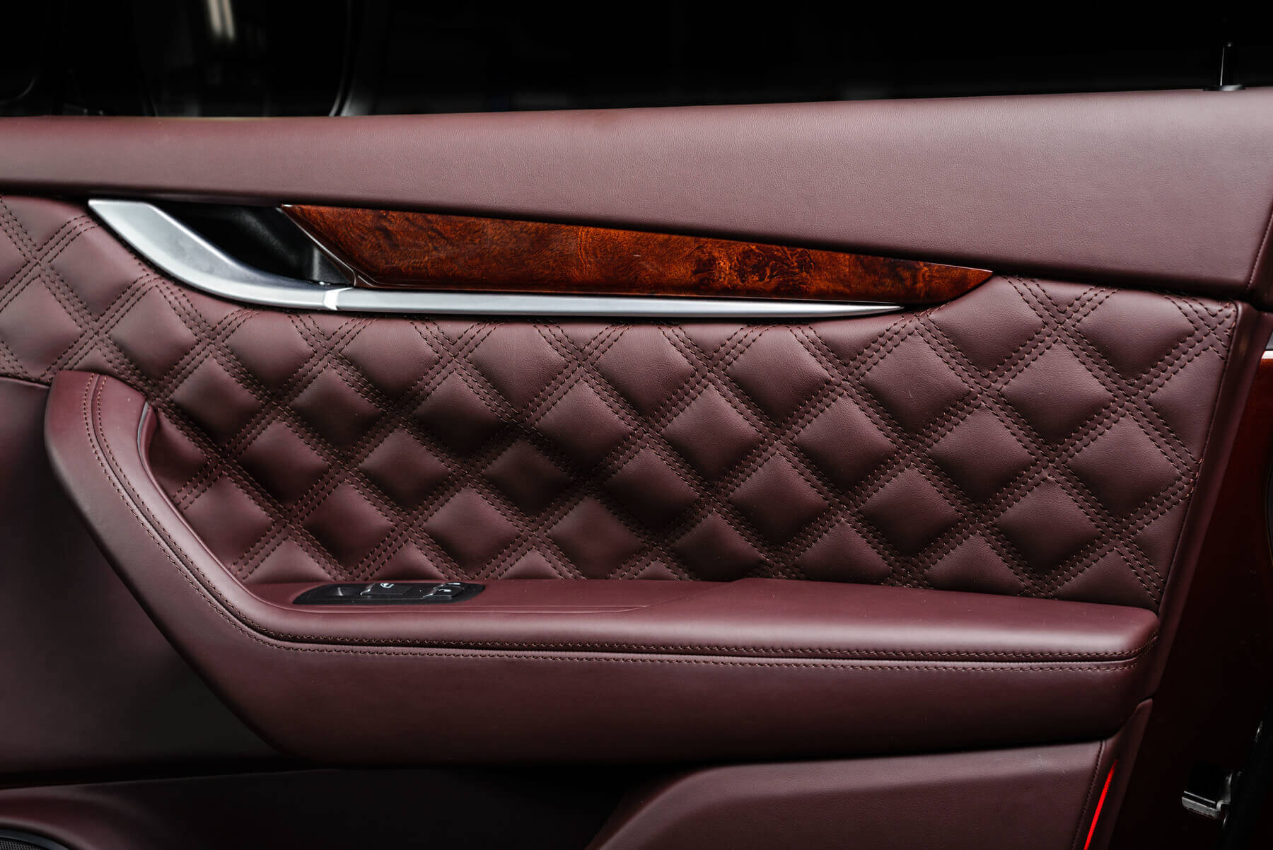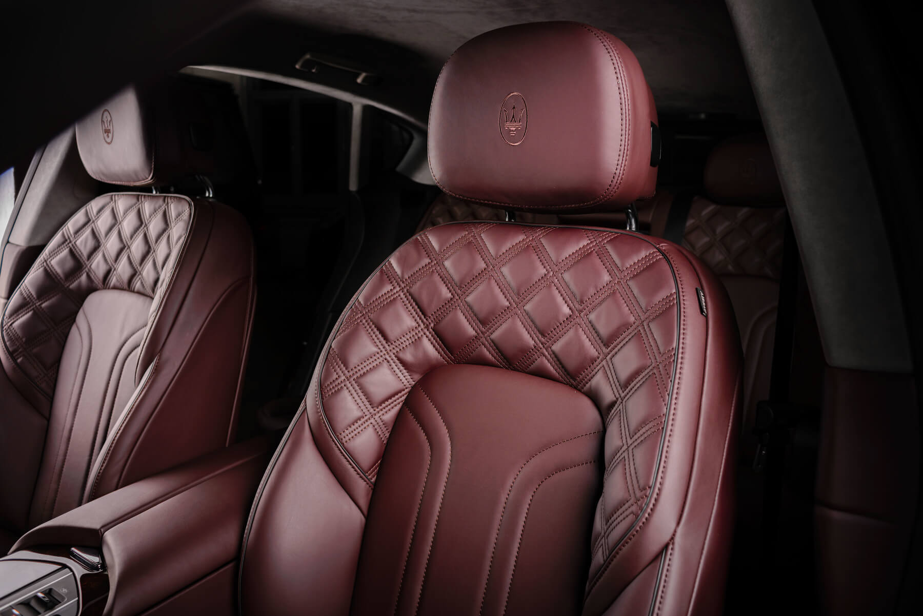Кожей перетянули абсолютно все элементы салона — торпедо, центральную консоль и ее боковые вставки, передние сидения и задний диван, подголовники, карты дверей. Для придания большей премиальности салону — выполнили уникальную вышивку ромбами на верхних частях сидений и центральных вставках дверных карт с тройной строчкой. Подголовники дополнительно декорировали вышивкой логотипа Maserati.
