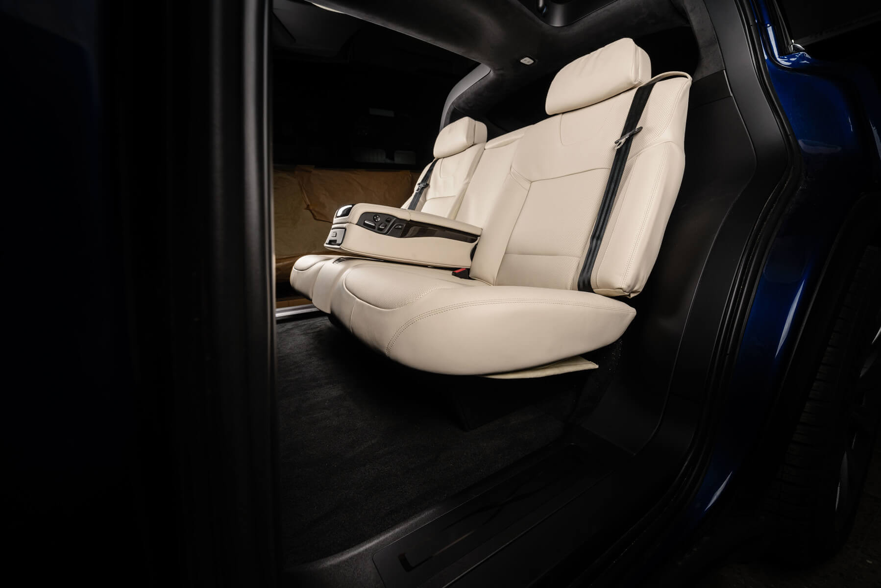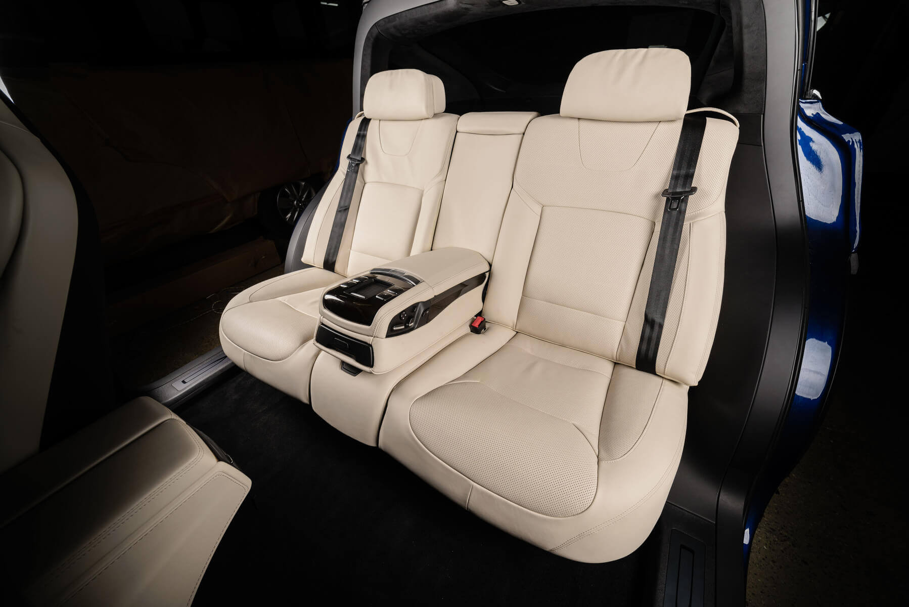 Затем приступили к главной фишке будущего салона — замене заднего ряда сидений на диван повышенного комфорта. В качестве замены был выбран диван BMW 7-series, который до установки в автомобиль был перетянут белой премиальной кожей в цвет передних сидений.